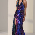 Halter Cowl Neck Allover Sequin Party Dress with Skirt Slit