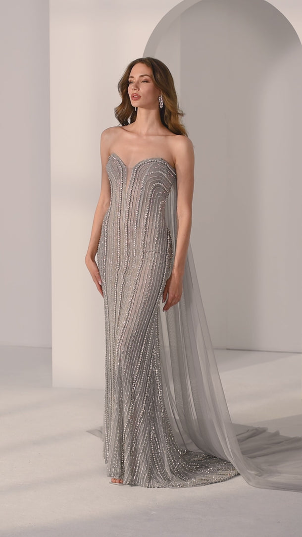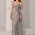 Step into pure drama with this sultry crystal sheath party dress. The plunging strapless sweetheart neckline and thigh-high slit create daring, flattering lines, while linear crystal beading on sheer tulle shimmers with every movement. A tulle watteau train adds ethereal flow, blending sexy style with elegant design.