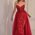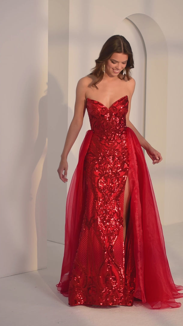 People won't be able to stop talking about you in this showstopping sheath party dress. The strapless cat eye neckline creates a fierce frame for your décolletage, while patterned sequin mesh shimmers with every move. A thigh-high slit adds sultry sophistication, and a detachable tulle overskirt brings drama and versatility, letting you switch from sleek and modern to full-on statement in seconds.