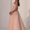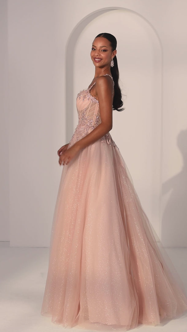 Step into enchanting glamour with this glitter tulle ball gown party dress. The sheer ruched bodice is adorned with delicate floral glitter details, while a lace-up corset back sculpts the waist for a flawless fit. The full A-line skirt flows effortlessly with sparkling layers of tulle, creating a dreamy, statement-making silhouette perfect for moments where you want to shine.