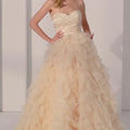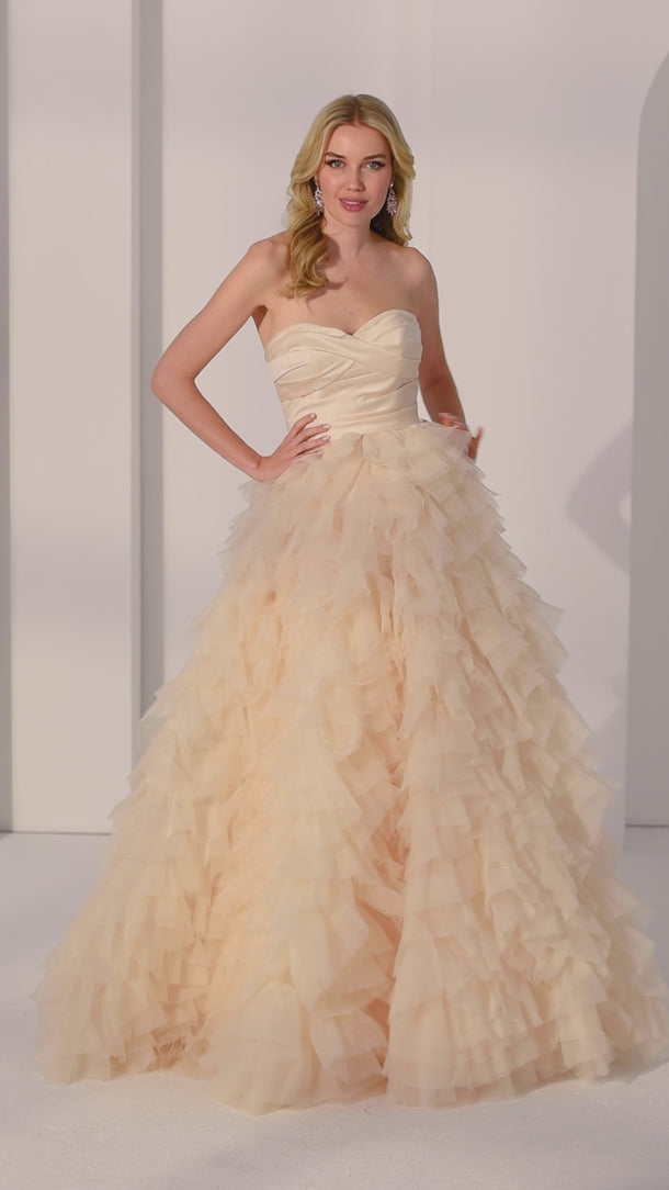Undeniably romantic, this ball gown party dress is designed to leave an impression. A draped satin bodice has an elegant sheen with a strapless sweetheart neckline that creates soft curves. Cascading tiers of organza and tulle create dramatic movement in the ruffled skirt for the perfect balance of elegance and statement energy.