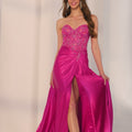 Swirling sparkle meets sculpted elegance in this A-line party dress. The strapless sweetheart bodice is adorned with swirling beaded net, adding shimmer and texture that catch the light from every angle. The asymmetrically draped charmeuse skirt flows with graceful movement, while a thigh-high slit brings sultry sophistication.