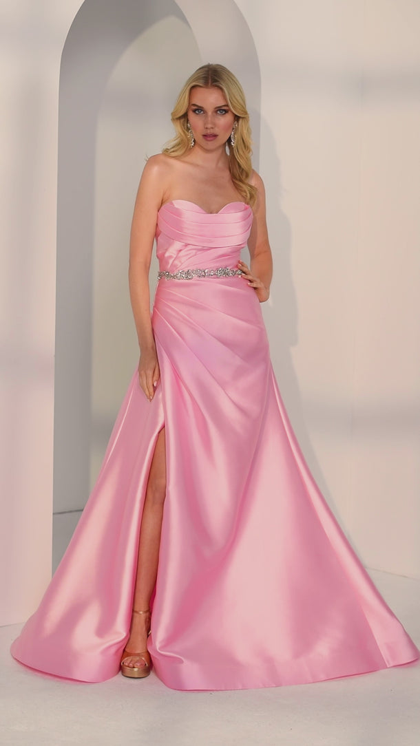 Achieve effortless elegance with this strapless mikado A-line party dress. Soft draping creates beautiful movement, while the sparkling beaded belt adds a touch of modern glamour. Clean lines meet subtle shine for a look that’s as chic as it is timeless.