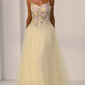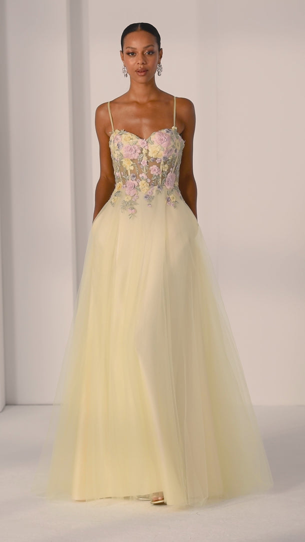 Romantic meets modern in this dreamy tulle A-line party dress. The sheer sweetheart bodice with corset boning sculpts the waist, while colorful threadwork floral embroidery adds playful, eye-catching detail. Light, flowing tulle completes the silhouette, creating a look that’s whimsical, feminine, and effortlessly party-ready.