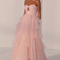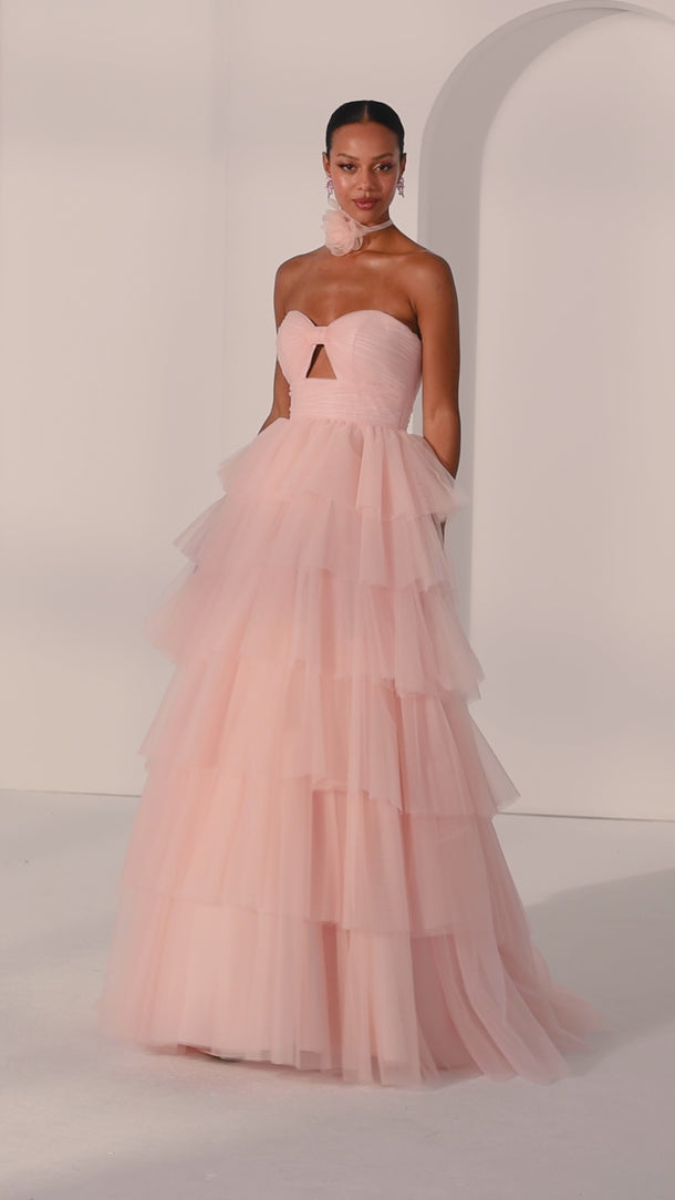 Feminine yet daring, this tulle A-line party dress is made to captivate. The strapless sweetheart neckline features a sultry center cutout for a touch of allure, while the draped bodice sculpts with ease. A tiered ruffle skirt finishes the look with movement and volume, equal parts romantic and unforgettable.