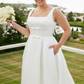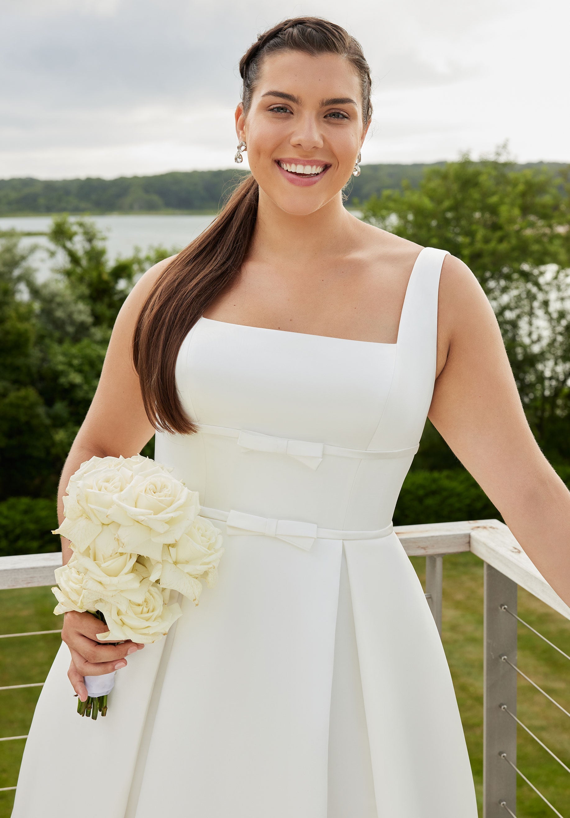 Our Sway designer wedding dress is a structured and clean A-line with sweet details. The gown glows in radiant satin with a crisp square neckline and thick straps that lead to the matching square back. The double banded waist accentuates the fitted bodice with small satin bows for a cute, coquette look. Box-pleating adds volume and texture to the skirt with the timeless touch of buttons down to the hemline. Shown in Ivory.