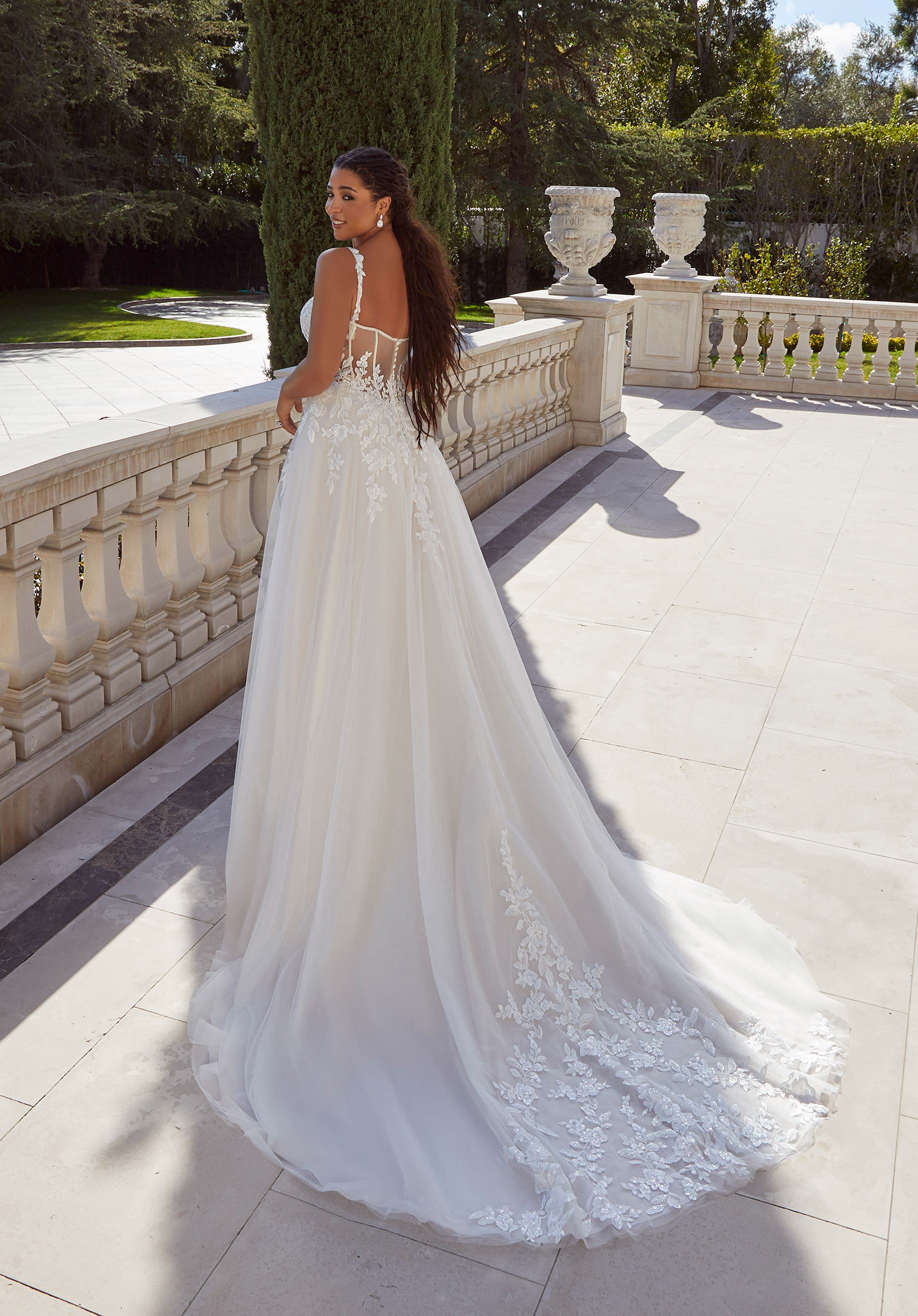 Our Tori designer wedding dress is cottagecore couture. The whimsical A-line has a sheer corset bodice designed with frosted floral embroidered lace that create a beautiful frame for the illusion back, highlighting the structured boning. The effortless tulle skirt floats around you for an ultra-flattering silhouette with a romantic lace trimmed train to complete the look. Shown in Ivory/Champagne/Honey.